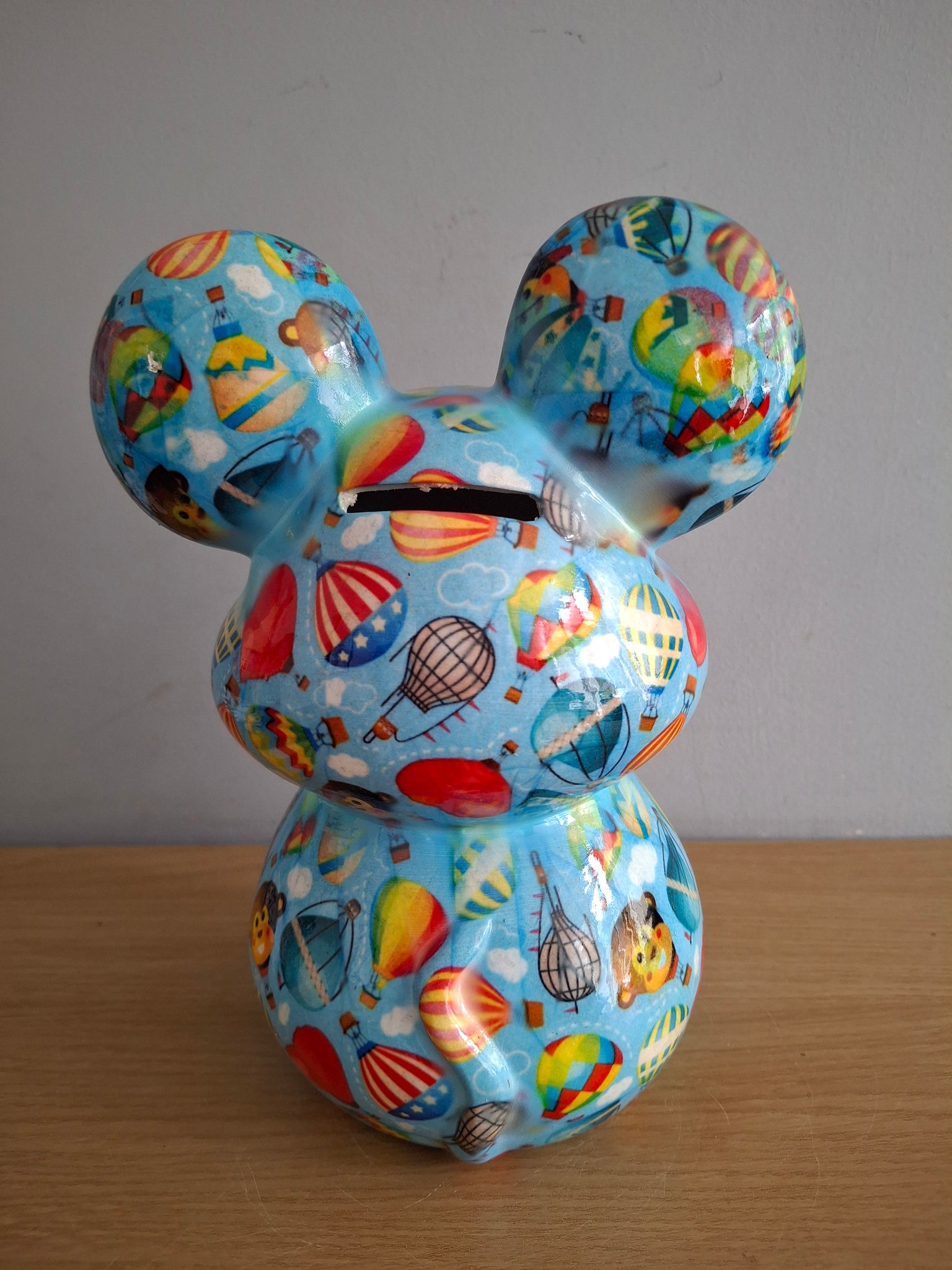 Made in Belgium with a gloss decoupage finish, the placements of the patterns can vary from the image shown as each money box is hand finished so overlays and pattern joints can be anywhere on the body, this just adds to the uniqueness of each money bank.